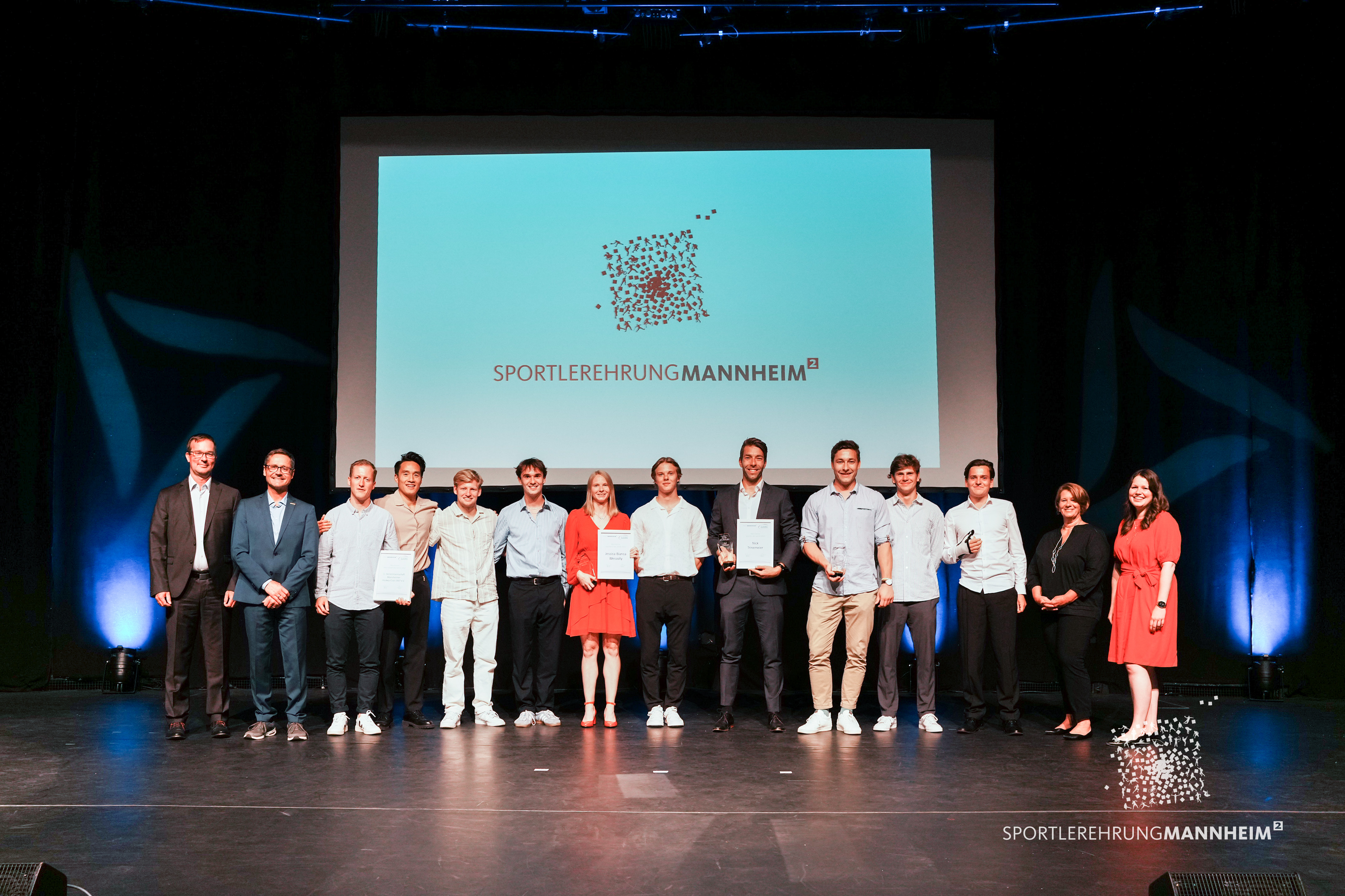 Nach zwölf Jahren und Zwischenstopps im Cinemaxx-Kino oder im coronabedingten kleinen Rahmen einer Pressekonferenz fand am 27.06.2023 erstmals wieder eine große Sportlerehrung der Stadt Mannheim im Bürgersaal des Stadthauses statt. 170 Athletinnen und Athleten aus 24 Vereinen und in 22 unterschiedlichen Sportarten standen als Beste des Jahres 2022 auf der Bühne und im Mittelpunkt des Abends. "Als Beste" bedeutet, dass sie alle eine deutsche Meisterschaft errungen, bei einer Europameisterschaft auf dem Treppchen gestanden oder an einer Weltmeisterschaft teilgenommen haben. Die Bandbreite war dabei groß: Ein Trio der Tornados wurde für den EM-Titel in der U12 ebenso gewürdigt, wie der 100-Meter-Weltrekord samt Doppel-WM-Gold des 81-jährigen Hartmut Krämer (DJK Käfertal) oder die Teilnehmer an den Special Olympics in Baden-Württemberg.